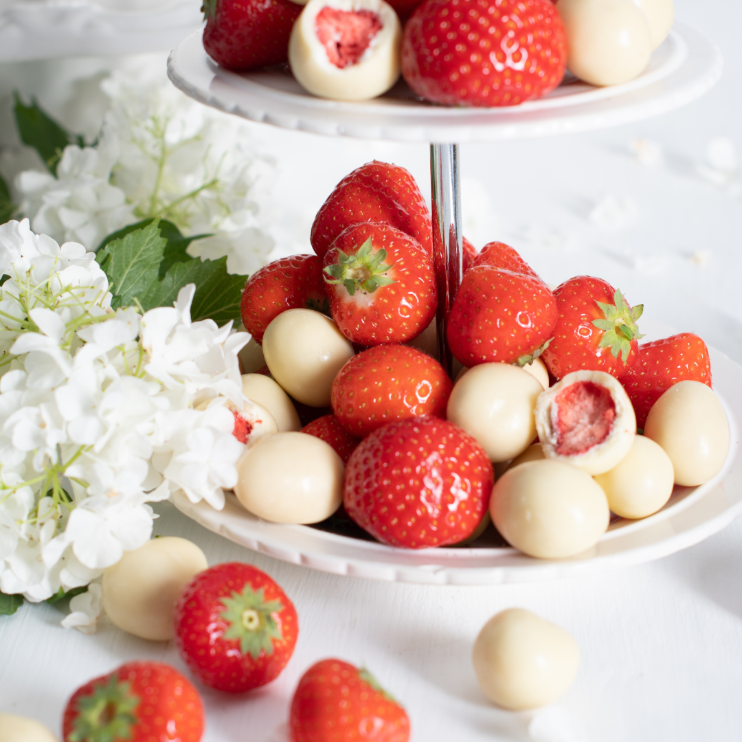 •    Lyofilizované jahody obalené v bílé čokoládě