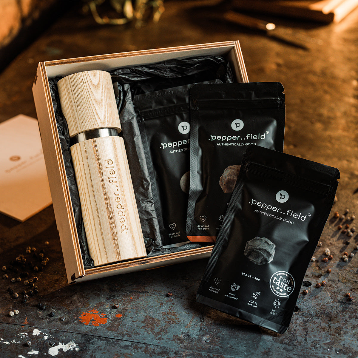 Moulin scandinave avec un ensemble de tubes à essai contenant du poivre de Kampot dans une boîte cadeau en carton (3× 10 g)